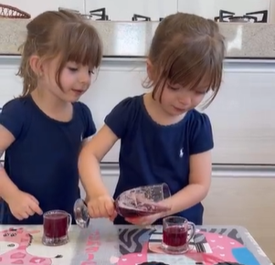 Esta é a cena de um vídeo, disponível no Instagram @fernandacintra.s, que mostra duas irmãs gêmeas fazendo o experimento de passar um líquido, parece ser suco de uva, de um recipiente para outro. O vídeo teve muitas visualizações na rede social e, além da experiência de conservação de quantidade, do trabalho de coordenação motora para pegar os recipientes e servir o líquido, foi possível observar também a forma como as meninas enfrentam os desafios.