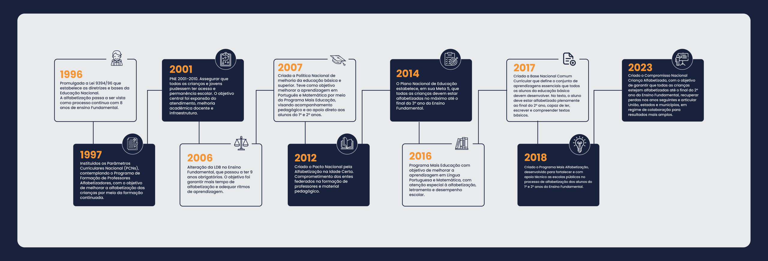 O Plano Nacional de Educação (PNE) 2014-2024, que perdeu a vigência em 2025, estabelecia a meta 05 em que todas as crianças devem estar alfabetizadas, no máximo, até o final do 3º ano do Ensino Fundamental. O PL 2614/24 Novo PNE, pendente de aprovação no Senado, define a alfabetização como prioridade nacional, visando garantir, por meio de metas e estratégias, que 80% das crianças estejam alfabetizadas ao final do 2º ano do Ensino Fundamental até o 5º ano de vigência da lei, alcançando 100% ao final do decênio.