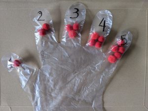 Essa atividade tem como objetivo, que a criança agrupe a quantidade de pompons em cada um dos dedos da luva. Para isso, enumere cada um dos dedos. Depois coloque dentro da luva 15 pompons da mesma cor, feche com durex a luva; aqui se deseja que a criança relacione os números e suas quantidades. Cores diferentes podem acabar induzindo a criança ao erro. É uma proposta sensorial, permitindo que a criança mova os pompons dentro da luva a fim de conseguir agrupar as quantidades.